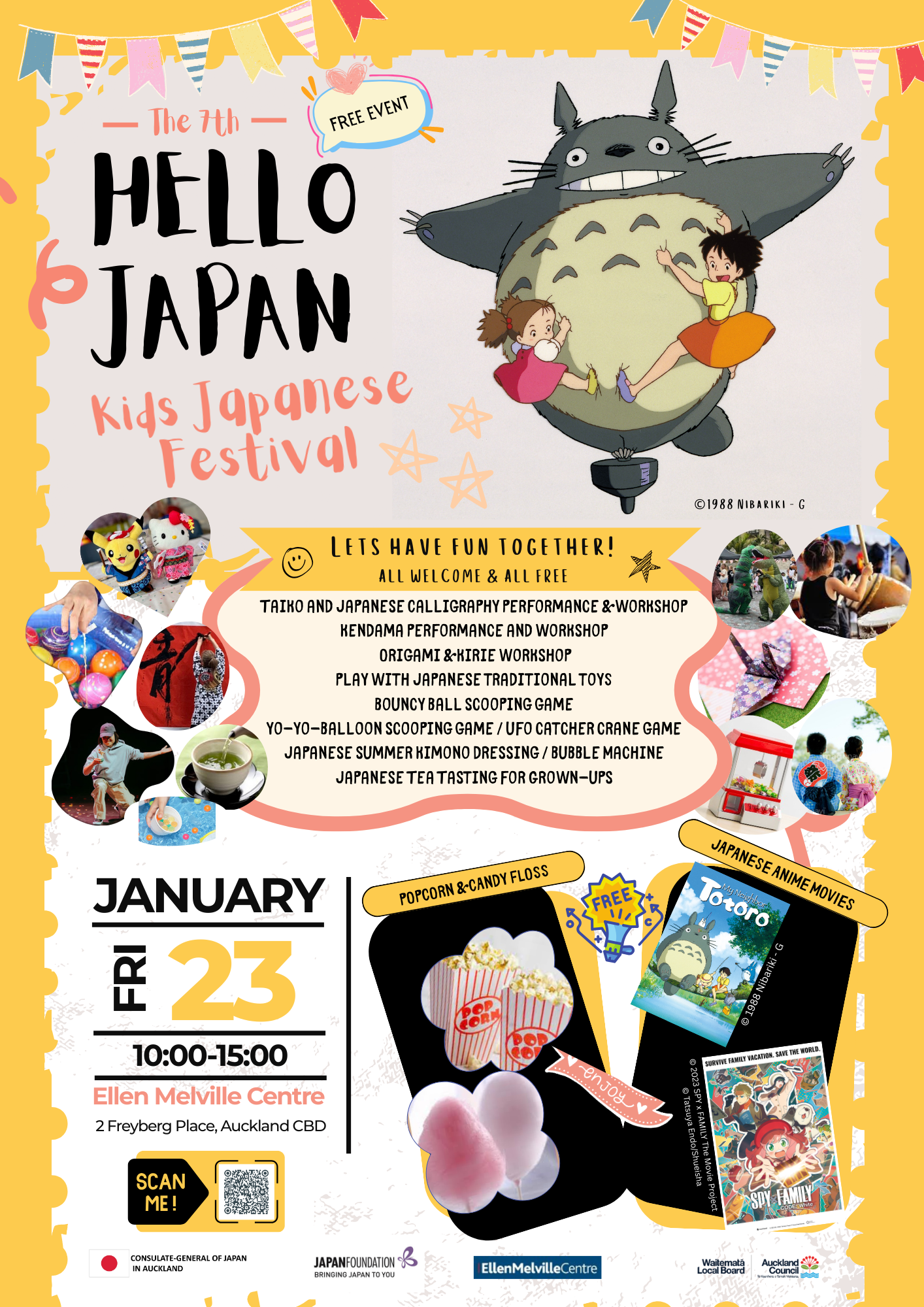 The 7th Kids Japanese Festival - Hello Japan 2025/12/2 10:30am My Neighbour Totoro 2:00pm Spy X Family CODE: White 10:00am-3:00pm Recommended Information Ellen Melville Centre