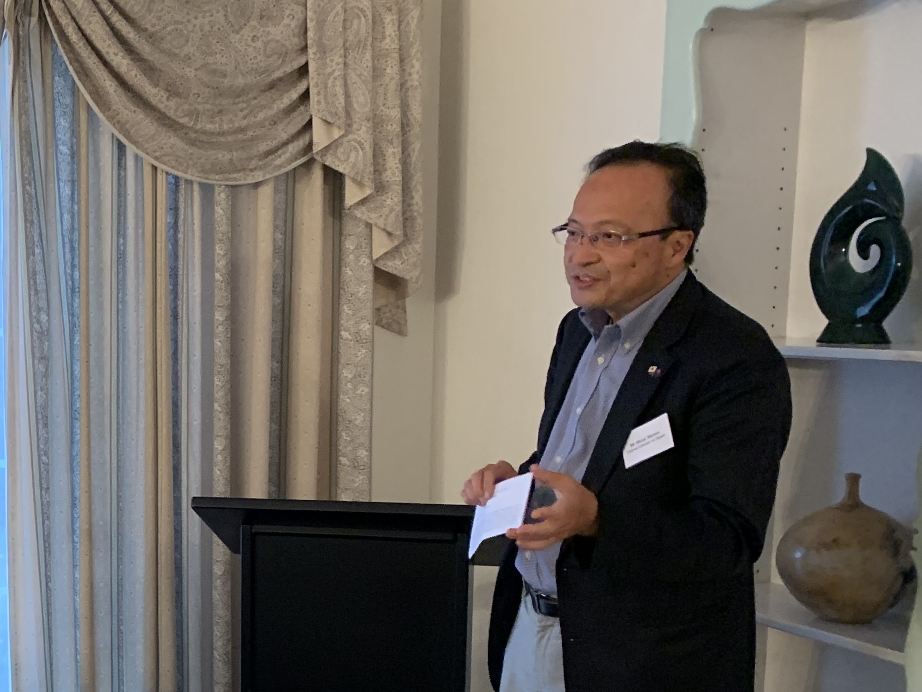 歓迎レセプションでは、松居総領事から帰国者への温かい歓迎の挨拶と関係者の協力への謝意を述べました。その上でJETプログラム参加者が将来の日・ニュージーランド関係を強化する上で極めて重要な役割を担っていることを強調し、帰国者が両国の新たな架け橋として活躍することへの期待とともに、今後もJETAA(JET Alumni Association)の活動を積極的に盛り上げていくよう励ましの言葉を述べました。
